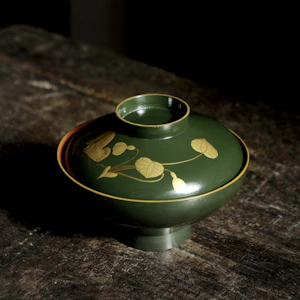 蓮の葉と垂纓 ◆緑で素敵。時代物 漆芸蒔絵蓋付椀 古漆器 骨董・antiques 古道具 大正〜昭和初期角愛- k a d o a i -¥2,200 -