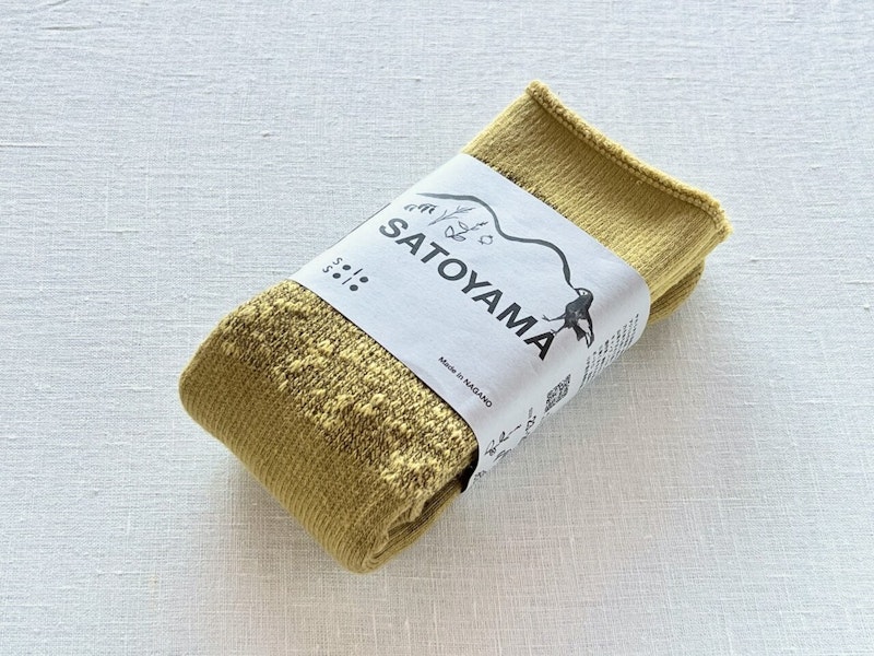 北アルプスの麓で染め物をするsolosoloさんが提案する、里山に暮らし、里山で遊ぶための靴下。総パイルの生地はクッション性があり、足袋のようなつま先は踏ん張りが効いて動きやすいのだそう。山をイメージしたデザインとコブナグサで染めた優しい黄色は、アウトドアのお洒落にぴったりです。