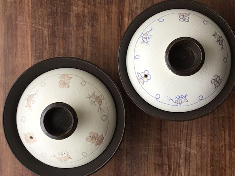 小川佳子さんが作る土鍋は、蓋に可愛らしい小鳥とお花の模様が施されています。約2人前にちょうど良いサイズで、日常の食卓でも気軽にお鍋を楽しめますね。土鍋は保温効果が高いため、スープや煮物を直火で温めてから食卓で取り分けるという使い方もおすすめです。