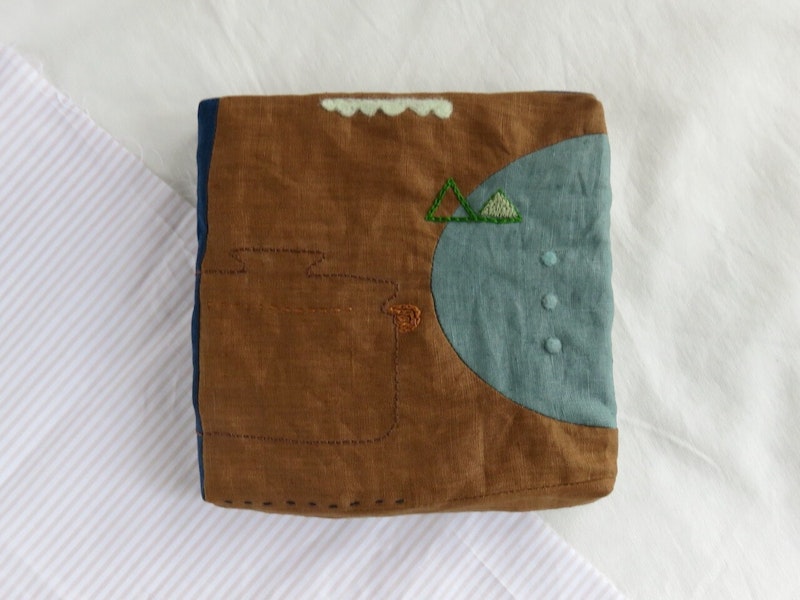 刺繍とパッチワークが楽しいリネンの鍋敷きには、作り手aoさんの遊び心がぎゅっと詰まっているよう。よく見ると山や湖、お鍋モチーフのような刺繍が散りばめられています。中にはしっかりとウレタンとアルミシートが重ねられ、熱々の土鍋を置いても安心です。