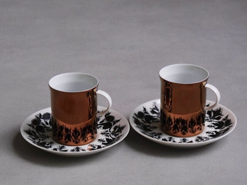 ドイツで約150年続く陶磁メーカー、Rosenthal(ローゼンタール)社製のデミタスカップ&ソーサーの2客セット。斬新なコッパー(銅)コーティングが施されたカップと、黒で鳥や花が描かれたソーサーが組み合わされ、個性的で華やかな雰囲気です。カップに映り込んだ景色と共に贅沢なコーヒータイムはいかがでしょうか。