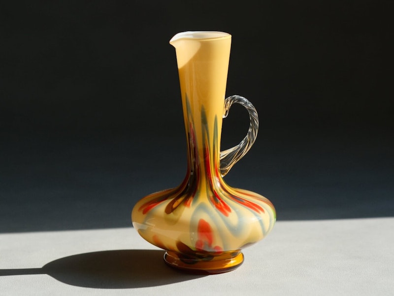 とろけるバタースコッチを思わせるような美しいガラスのフラワーベース。イタリア・ヴェネチアのムラーノ島で工房を設立したガラスデザイナー、巨匠Carlo Moretti(カルロ・モレッティ)が手がけた一点です。乳白色のベースにアンバーが混ざり、さらにオレンジ、ブルーが重なって、モダンで革新的な唯一無二の表情を生み出しています。現在も世界中の美術館やコレクターに愛されているブランドです。