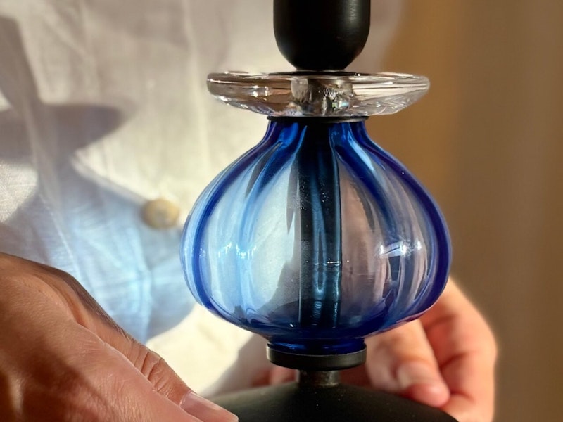 スウェーデンを代表するガラス作家のエリック・ホグランが手がけたキャンドルホルダー。青いガラスのふっくらとしたフォルムは、ほころぶ前の蕾や、貴婦人のドレスのようにも見えます。自然光の下では美しい青色の影を、日が暮れてキャンドルを灯したときにはまた異なる表情を見せてくれることでしょう。