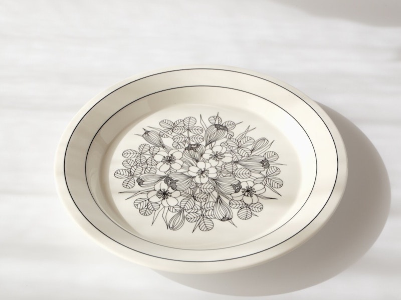 1978〜79年の2年間のみ作られた、ARABIA社製「Krokus」シリーズのプレート。エステリ・トムラによるクロッカスの花はそっと息づくような細い線で描かれ、北欧の早春を思わせる静かな表情をたたえています。復刻版とは異なる、当時ならではの線の揺らぎややわらかな白色を味わうことのできる特別な一枚。