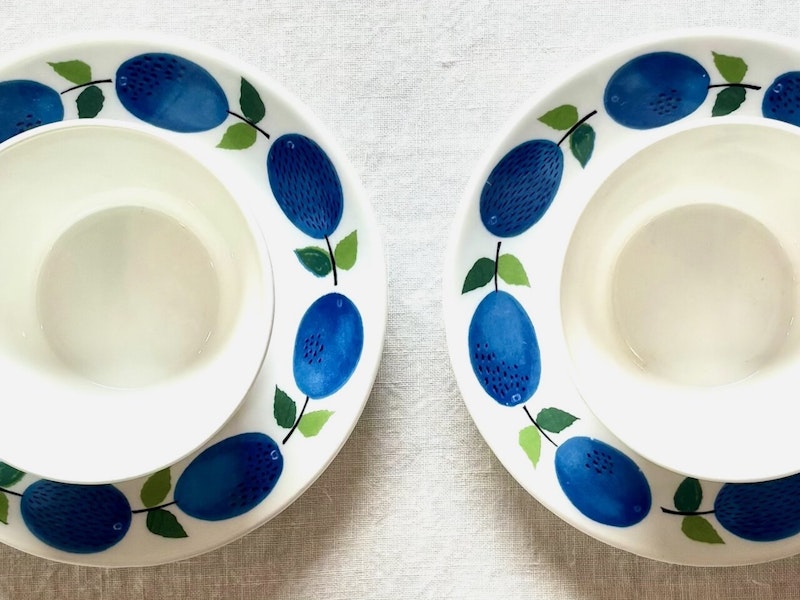 青いプラムが連なって描かれたGustavsberg(グスタフスベリ)製のカップ&ソーサー。転写による絵柄は一つずつ表情が異なり、筆のタッチや色の濃淡など原画の息づかいが残るプラムの実は見ていて飽きることがありません。絵本の1ページのような親しみの溢れるカップ&ソーサーと一緒に、冬の朝を迎えたいですね。