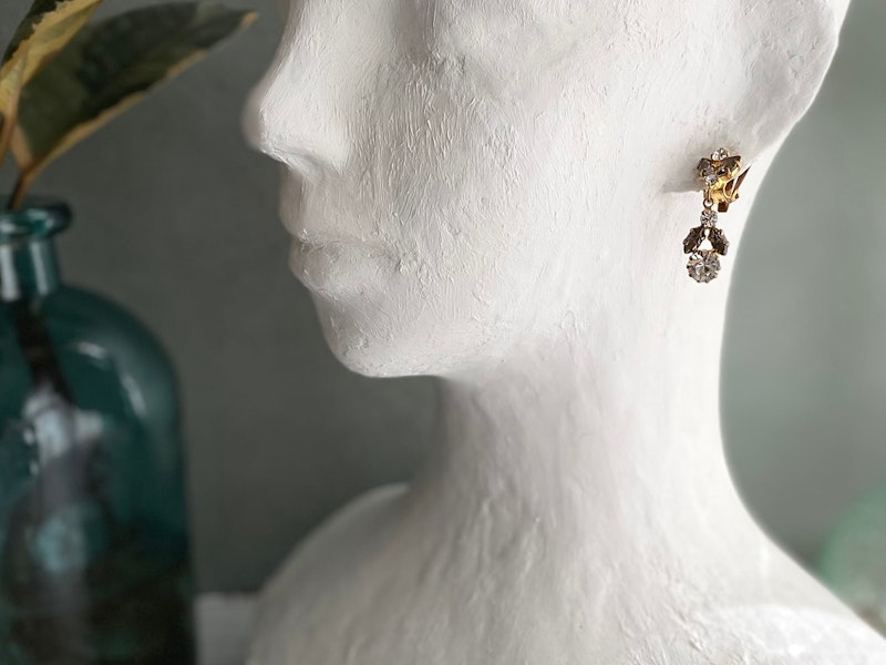 クリスタルがきらめく、1960〜70年代アメリカのイヤリング。深みのある風合いとビジューの輝きがクラシカルな雰囲気です。花のかたちにも見えるデザインは、フォーマルなシーンにも、カジュアルな装いにもぴったり。春のお出かけが待ち遠しくなりますね。