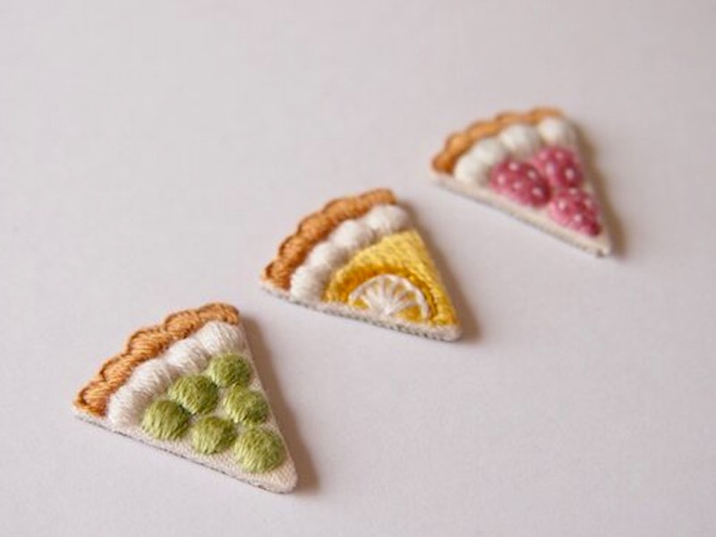 フルーツの宝石、シャインマスカットのタルトの手刺繍ピアス。ひと針ずつ丁寧に刺繍で作られ、ぷっくりと美味しそうな仕上がりです。遠くから見ると三角モチーフに見えますが、よくよく見るとフルーツタルト!という遊び心のあるデザイン。レモン、イチゴ、お好きなものをどうぞ。
