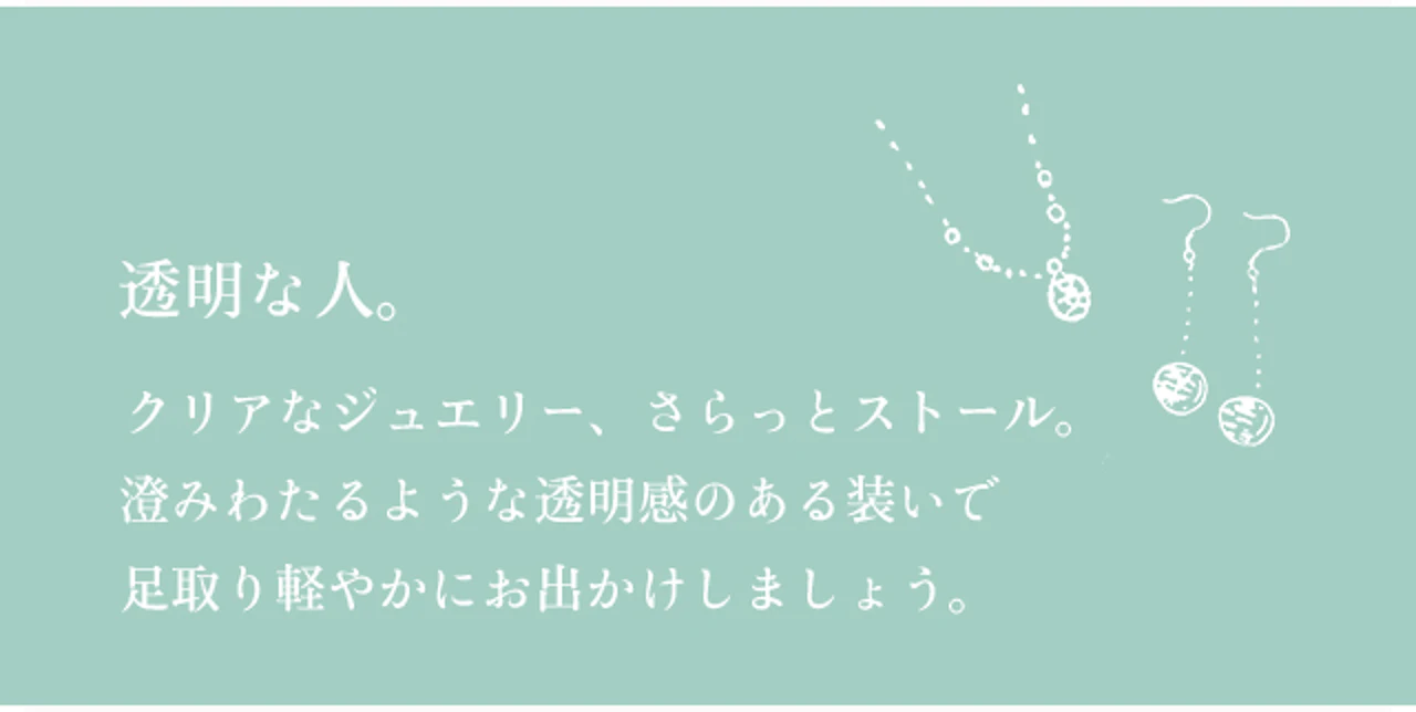 晴れの日には、鮮やかなブルーのネックレスを。 雨の日には、水のようにクリアなリングを。 たまには好きなジュエリーに合わせて、その日の格好を決めてみるのもいいですね。カラフルジュエリーと爽やか...