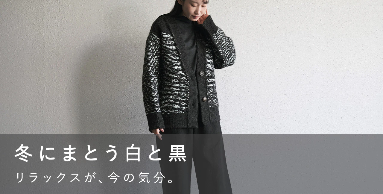 冬のおしゃれの楽しみ、白と黒の装い。 ほっこりあたたかな素材と リラックス感のある形で ふわりと優しく、わたしらしい モノトーンコーデのできあがり。 さて、週末はどこへ出かけましょうか?