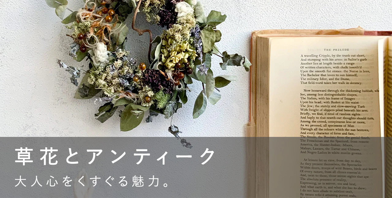 落ち着いた深みのある色に、乾いた質感。 どこか似ているもの同士、 秋の草花とアンティークの組み合わせ。 テーブルやスツールに、玄関や窓辺に、 大人心をくすぐるアレンジを 気ままに楽しん...