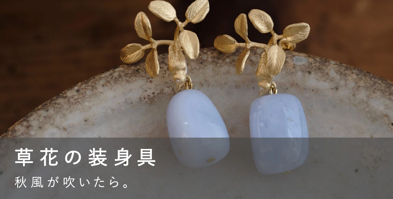 夏から秋へと移りゆく季節。 ふと目に留まるのは 風に揺れる、素朴な花や実の姿。 美しい草花の装身具を身にまとい、 自然に寄り添うように 季節の訪れを感じてみませんか。