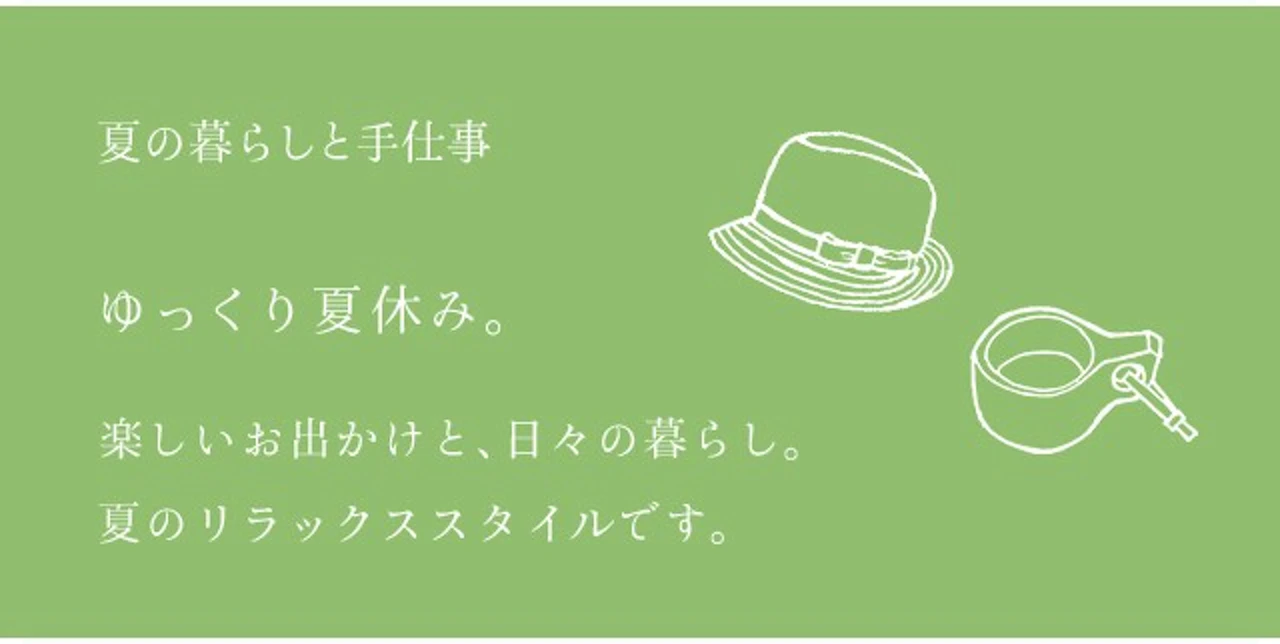 やさしい肌触り、軽やかな素材感。 自然からの、わたしたちへの贈りものです。風そよぐ、涼しい衣服。颯爽とお出かけ、夏バッグ。日差し遮る、わたしの味方。からだ喜ぶ、天然素材。編集後記手元にある衣服...