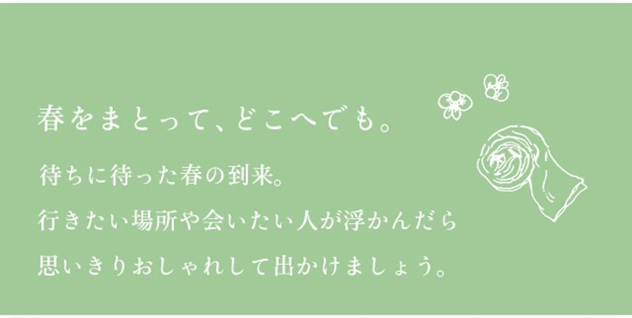 ふんわりピンクや鮮やかイエロー。 あたたかな空気ややわらかな日差しに 似合う春の色、探しにきませんか? 淡く、やさしく、春の色。ビビッド、カラフル、元気色。すっきりクリアな爽やかカラー。ド...