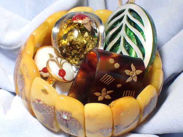素材に 琥珀や真珠、ガラスなどを使い、デザインは伝統工芸の枠にとらわれず、季節の花々や可愛らしい動物など 多種多様なものになっています。