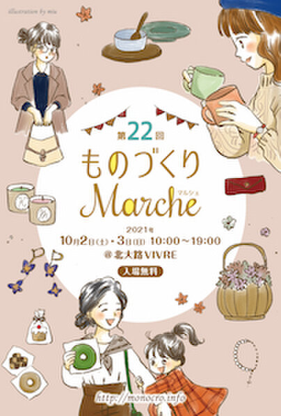 アクセサリー、布小物、木工品、革小物、陶器、イラストなどさまざまな手づくり雑貨や焼き菓子、パンなどの食べ物のブースが並びます。