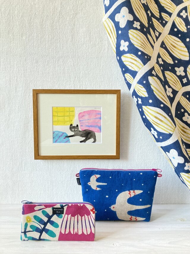 絵画作品のほか、日傘、サコッシュ、財布、などさまざまなアイテムが並びます。