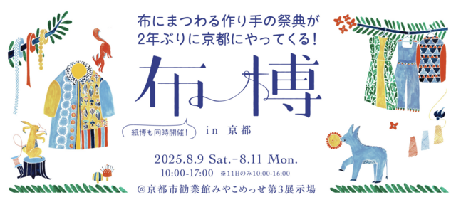 8月9日(土)・10日(日)・11日(月・祝)の3日間、「紙博 & 布博 in 京都」を開催することが決定! 布博を京都で開催するのは、2023年4月以来の約2年ぶり。ひと目見れば誰もが心を奪われてしまうような美しい作品を携えて、テキスタイルデザイナー、刺繍作家、ぬいぐるみ作家、洋裁師に手芸店など、“布”をめぐる様々な作り手やお店が一堂に会します。