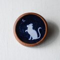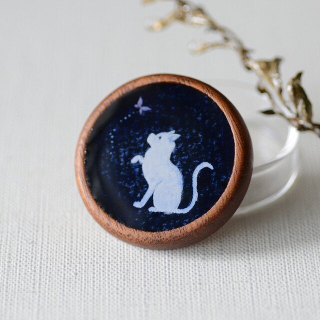 濃紺の背景にネコと蝶を描いた絵を樹脂で閉じ込めたブローチ。