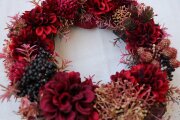 ワインカラーのマムをメインにしたリースです。深紅のマムをふんだんに使い、間には実ものをちりばめました。ちょこちょこ飛び出ている草っぽいのもリースに動きをプラスしてくれています。