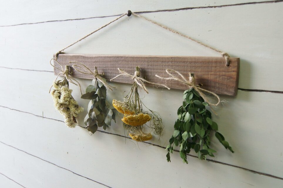 自家製ドライフラワーを古材風に加工した板にセットしました。