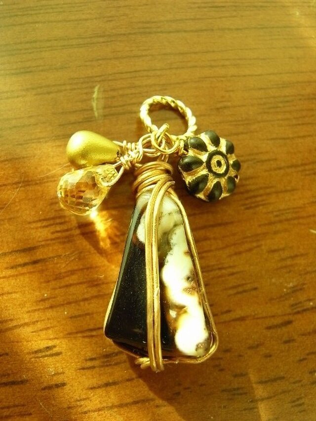 また、これらにピッタリのゴールドとブラックのお花のチェコビーズなどを合わせ、可愛くも個性的なペンダントトップになりました♪