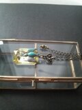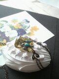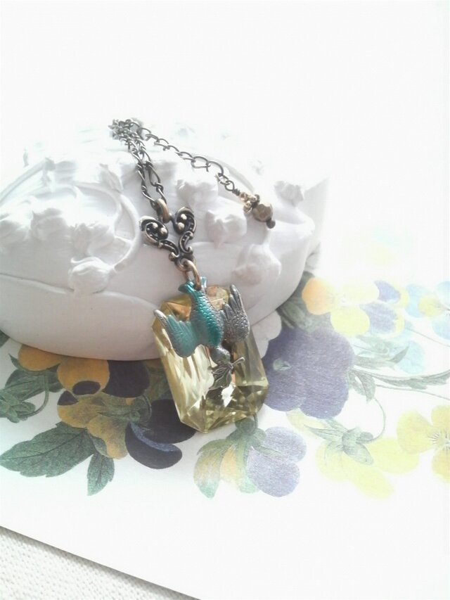 ハンドペイントで描かれた青い鳥のメタルパーツに包まれたシトリングラスストーン。