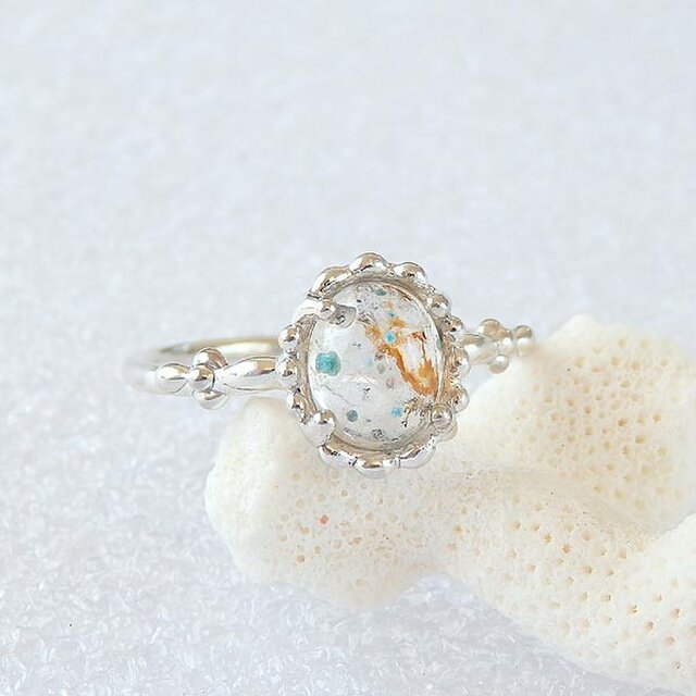 ジラライトを内包した小粒のクォーツを粒飾りの華奢なリングに仕上げました。