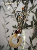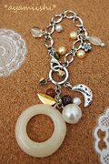 大きなドーナツ形のイエロージェイドをトップに、パールやアメジスト、スワロフスキー、メタルパーツなどをたくさん添えた、豪華なバッグチャームです。
