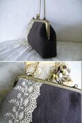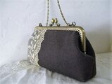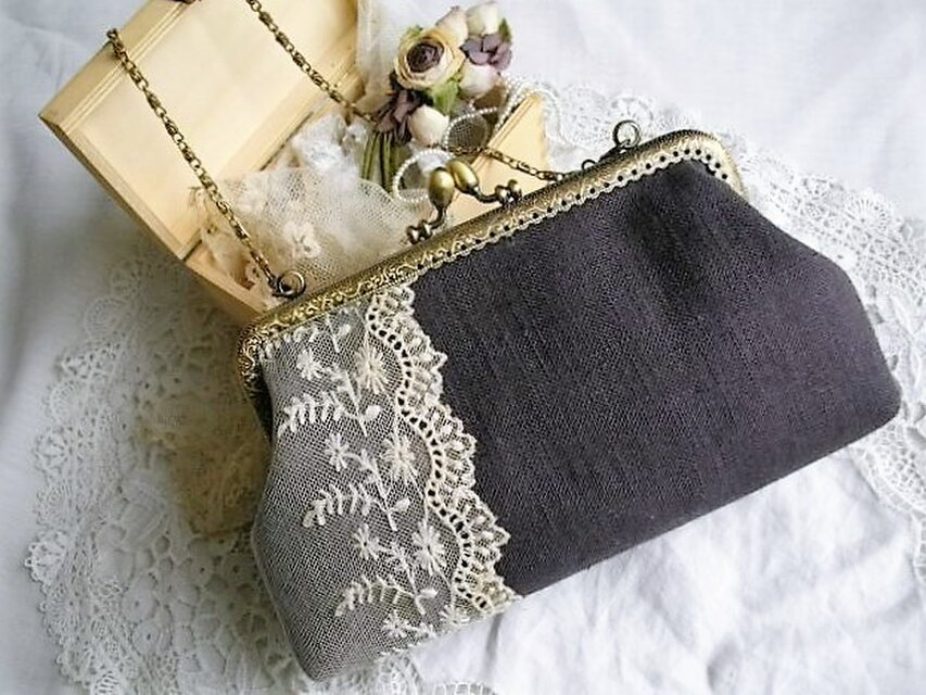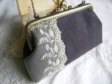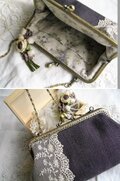 ダークブラウンに近いシックなパープルリネンにアンティークレースをのせたがま口バッグ