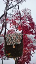ふたは手編みで、ショルダー部分に同じ毛糸柄を入れたくなり、肩紐は織りました。肩紐の、毛糸と同じ柄の織り込み部分は、アシンメトリーになっています。縦糸は紺色です。