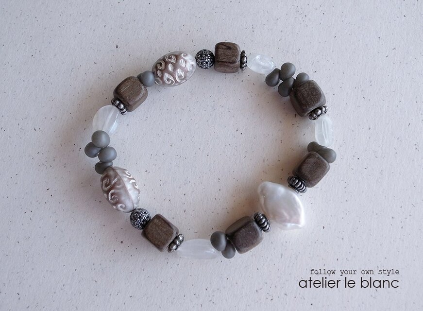 グレーブラウンのウッドビーズや素朴な柄の入ったグレーベージュのビーズが、