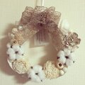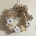 こちらは天然のコットンやソーラーローズ、毛糸を丸めて作った毛糸玉に白い木の実やシュガーピック、パールピック等で飾り付けしたゴールド×ホワイトの配色のリースです。