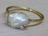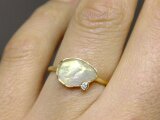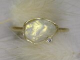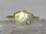 イエローのシラーが可愛いゴールデンムーンストーン(アンデシンラブラドライト)2ct原石*月光と星の煌めきをイメージしてダイヤモンドを添えたアンティーク調K18リング*自然光ではイエローを基調にブルーやグリーン、オレンジのシラーを楽しめます*殆どが小粒のルースで1ctを超えるものは大きいといえるほど。。ゴールデンとの俗称もあるようにムーンストーン等フェルスパー属では最上位の希少性を誇ります*ムーンストーンらしい穏やかさの中に確かな強さを感じられるようなシラーが魅力です*1~15号(推奨サイズ)の範囲を目安に調整可能、サイズ確定後に原石に合わせた石留めを致します*