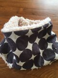 ・素材はドット柄が綿80%麻20%の綿麻地で、レース部は、リネン100%の上にオパールレースを重ねていています。レースは綿60%ポリエステル40%で縫製前に水通ししています。スヌード裏はポリエステル100%のプードルファーです。
