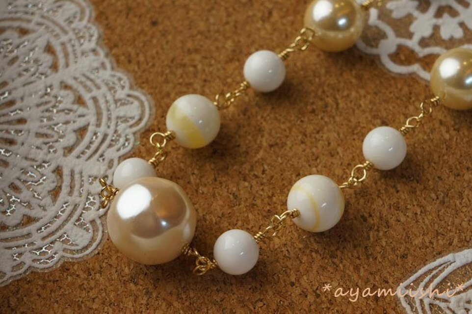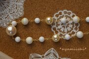 優しく光るヴィンテージパールを3種類、ホワイトオニキス、ホワイトシェルを使ってあります。
