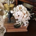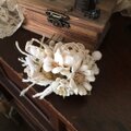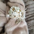 オフホワイトに染色したビロードのミニ薔薇やデージー、すみれなどとレースのりぼんなどを合わせた小さなコサージュです。