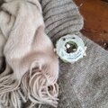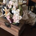 アンティークなベージュやピンクに染色したデージーやすみれ、すずらんなどでリースの形のコサージュを作りました。