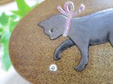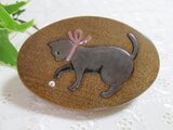 手のひらサイズのハンディミラーです。銀色の猫がカタツムリを見付けた時の様子を蒔絵で表しました。猫は本銀で立体的にし、目と首のリボン、カタツムリは螺鈿です。見る角度により変化する輝きをお楽しみください。鼻、目の周り、リボン、カタツムリの線描きは本金を使用しています。