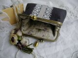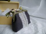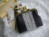 ダークブラウンに近いシックな色合いのパープルリネンにアンティークレースをのせたがま口ポーチ