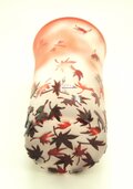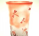 小振りで細身の赤いグラスいっぱいに、濃淡のついたもみじをふんだんに散りばめ、2匹のトンボを飛ばした秋らしいグラスです。