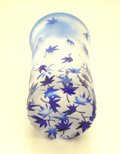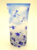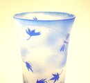 小振りで細身の青いグラスいっぱいに、濃淡のついたもみじをふんだんに散りばめ、2匹のトンボを飛ばした秋らしいグラスです。
