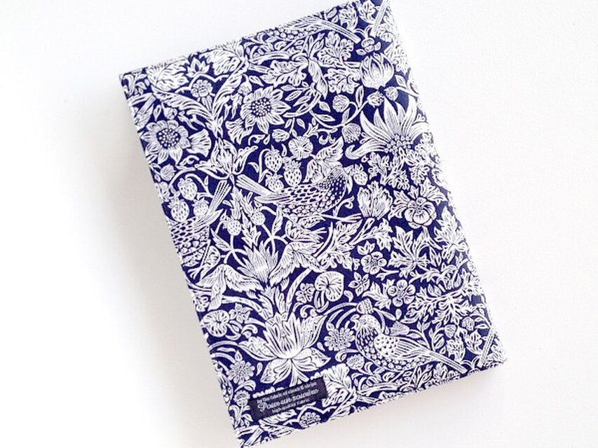 リバティの人気生地、ストロベリーメドウ Strawberry Meadow(ネイビー)とハーフリネンの生地でA5本サイズのブックカバーを作りました。