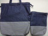 レッスンバッグ・シューズ入れ・体操服入れ・巾着袋【紺デニム×紺白ボーダー】薄地