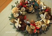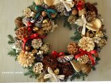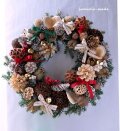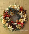リース素材:アーティフィシャルフラワー(ゴールドの木の実・クルミ・コニファー、など)、ナチュラル資材(松かさ・チスパ・アンバーバーム・イガナス・ハス・シダローズ・ハートポッド・ダフノイデス、等)、その他(リボン飾り:取り外すことはできません)。