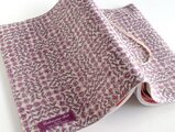 この生地は、皆川 明さん(ミナ・ペルホネン)のデザインで有名で、人気があります。ブロック上に並んだバラ、色彩がやさしくとても上品な柄です。 生地の地の色がオフホワイト、バラの色がライトパープル、葉の色がライトパープルです。
