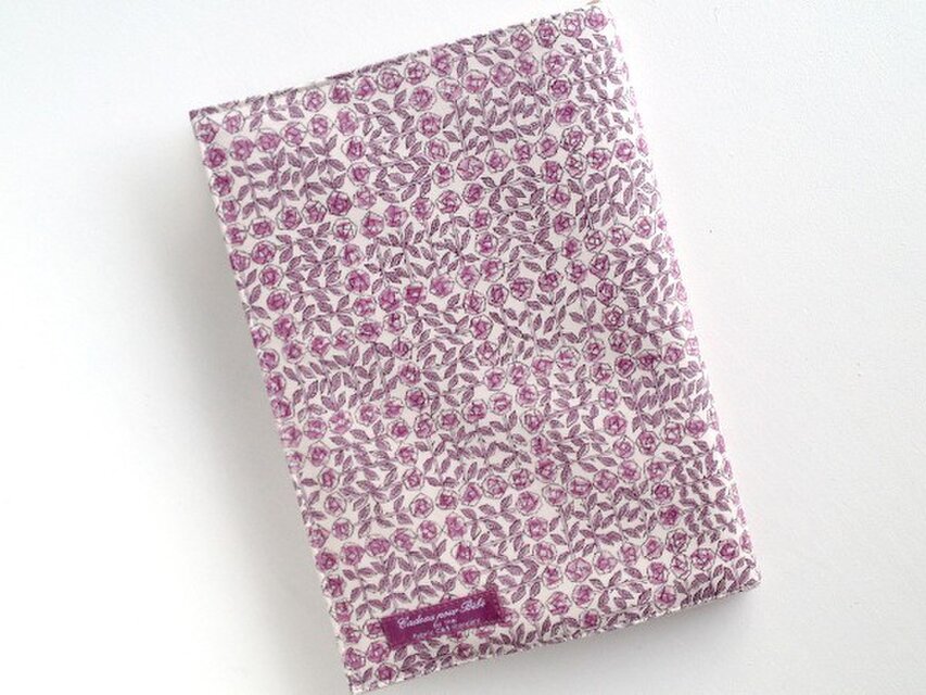 リバティの人気生地、スリーピングローズ Sleeping Rose(パープル)とハーフリネンの生地でA5本サイズのブックカバーを作りました。