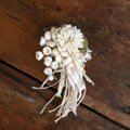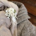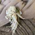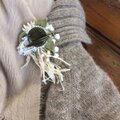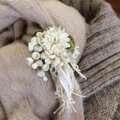 オフホワイトに染色したすずらんとデージーとすみれにレースのりぼんなどを合わせた小さなコサージュです。