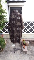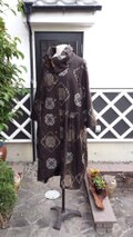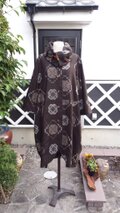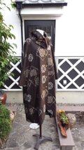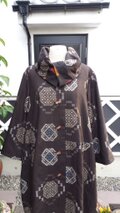 ご覧頂きありがとうございます。 泥大島で(龍郷)コートを作りました。絹100%です。裏地も絹100%です。 衿は、変形でかわいらしく、裾はコクーン型でかわいらしいです。ボタンは、かわいい大きな木のボタンです。脇ポケット2ヶ所ございます。 総裏地付きで軽くて温かいです。