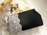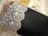 黒リネンにアンティークチュールレースをのせたがま口ポーチ