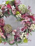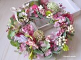 ベージュやグレージュのニュアンスカラーが美しい、ボリューム感のあるスワッグです。白バラ、ドライフラワー風の紅バラをアクセントにどこか時間を超えた幻想的な雰囲気も感じられてとても心惹かれます。 また、スワッグの向きや花器に応じた飾り方を提案して下さっているので、これから色々な表情を見つけて行ければと思います。今回も素敵な作品をありがとうございました。
